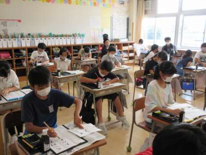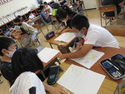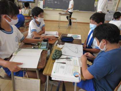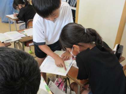全体のバランスに気を付けながら真剣に取り組んでいる書写の時間。教頭先生に100点とほめられて嬉しそうな表情を見せる子もいます。算数では、グループで考えを出し合っています。