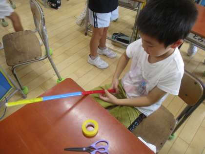 子供たちの作ったフリスビーは、新聞を丸めて枠をつくり、その中に思い思いに絵を描いた画用紙をはりつけたという、自分だけのフリスビーです。