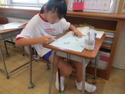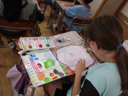 夏休みや宿泊学習の思い出を絵にかいて表しています。色々な工夫をしながら一生懸命かいています。