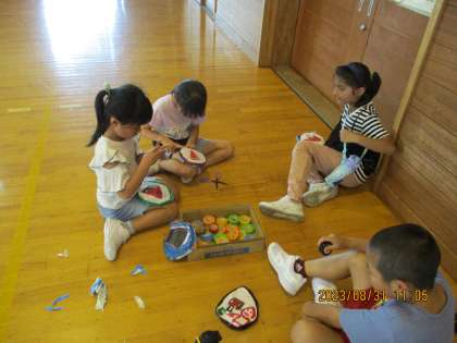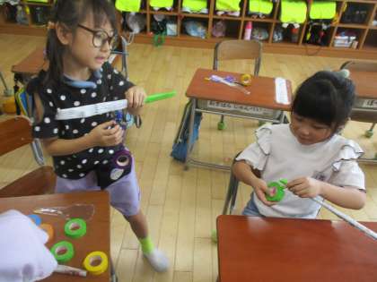 西瓜や花火、カブトムシ等、思い思いのものを描いて、フリスビーに貼り付けました。