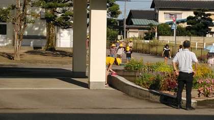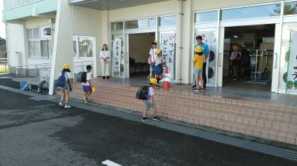 今朝の児童玄関の様子です。太陽が出ていたのでミストが気持ちよさそうでした。