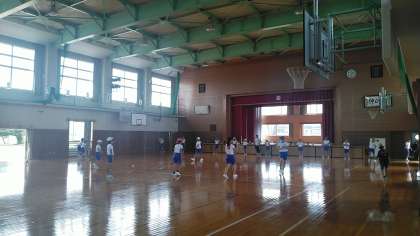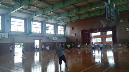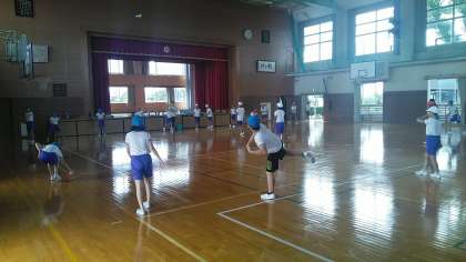 6年生の5時間目は、体育科の学習でした。体育館でジャベリックボールを投げていました。