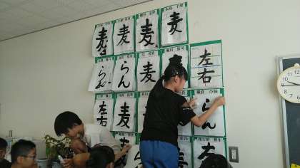 4年1組の2時間目は、書写の学習でした。「らん」という文字を毛筆で書いて、掲示スペースに自分で貼っていました。