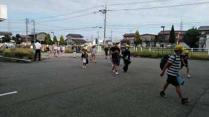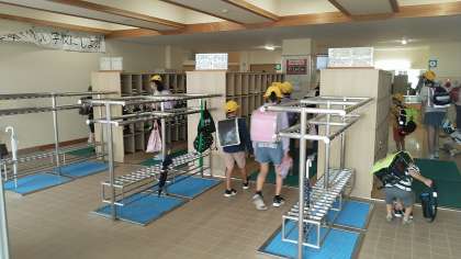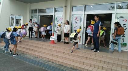 今朝の児童玄関の様子です。暑くもなく、気持ちのよい風がふいていました。