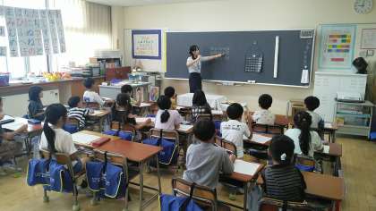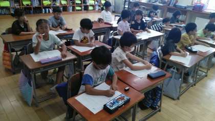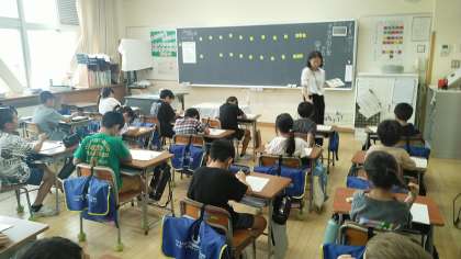 今日は、いつもより早く帰るので、1時間目の終わり頃に、2年生は、連絡帳を書いていました。書けた子供から先生にチェックしてもらっていました。
