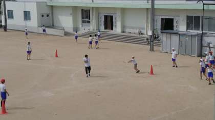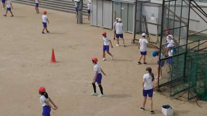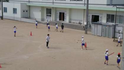 6年生の3時間目は、体育科の学習でした。グラウンドでラケットベースボールをしていました。ピッチャーは、固定(先生)みたいです。