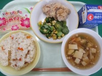 ・ちらし寿司 ・牛乳 ・鶏肉のから揚げ・コーン和え ・すまし汁 ・お祝いデザート検食、異常なし。 今日は「入学お祝い献立」です。 鶏肉はサックリ揚がっていて、ご飯が進みました。すまし汁も上品な味付けで...
