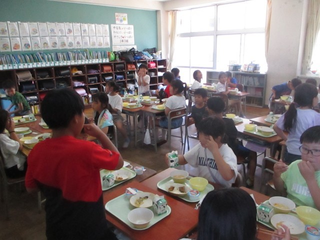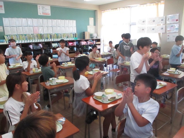 今日の給食には、「名誉島民100人誕生プロジェクト」達成のお祝いとして、給食に特別の「お祝いシャーベット」が付きました。