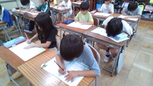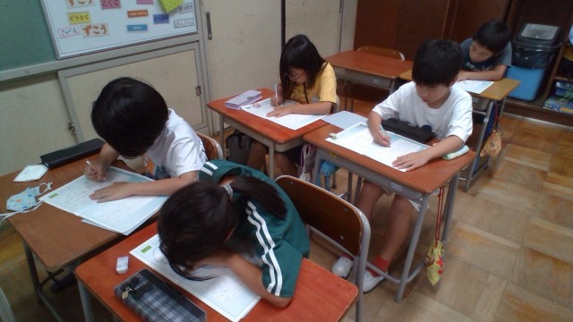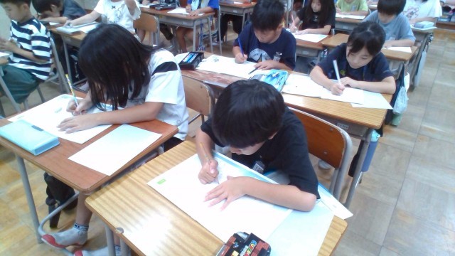 書写では、1学期学んだことを生かして、「スイミー」の文章の一部を視写しました。自分たちで学習環境を整えてから、よい姿勢や美しい字形を意識して集中して書く様子が見られました。