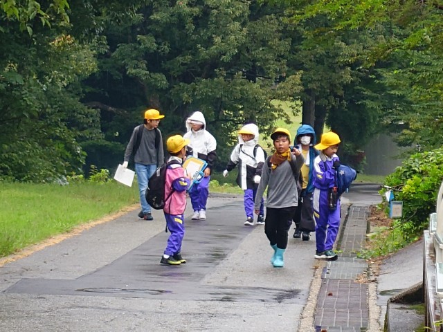 村内ビンゴ実施中です。時折小雨がおちてはいますが、元気にポイントを探しています。
