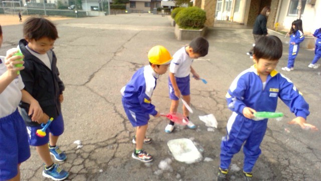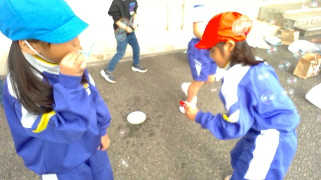 つぶつぶのシャボン玉を作りたい、大きなシャボン玉を作りたい・・・!という願いをもちお家から材料を持ってきていざ挑んだ一回目のシャボン玉では、材料がシャボン液に濡れてヨレヨレになり悔しい思いをしている子がいました。みんなでどうすれば上手くいくのかを話し合い、2回目のシャボン玉は絶対成功させるんだ!と意気込んでシャボン玉の材料を改良していました。そして、2回目のシャボン玉の日、改良した材料でたくさんのシャボンだまを作り嬉しそうにしている姿を見ることができました。