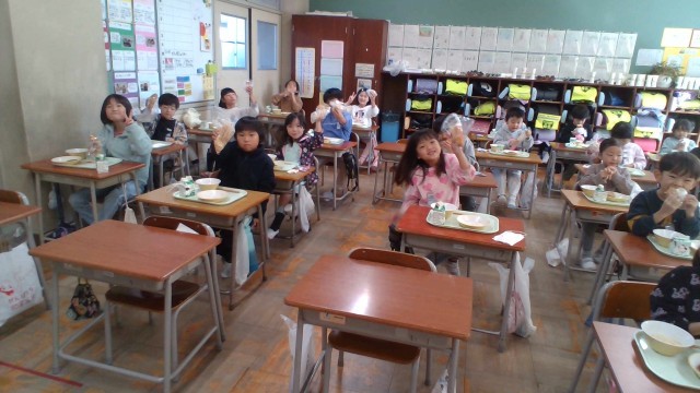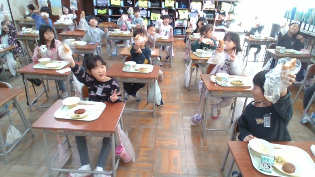 揚げパンでカンパイ! 公開日 2025/11/13 更新日 2025/11/12 1年生の活動 口のまわりにきな粉をつけて、嬉しそうにほおばる子供たち。みんな笑顔♪いつもより食べキリンできた人が増えました。りつこ先生、調理員さん ありがとうございました!