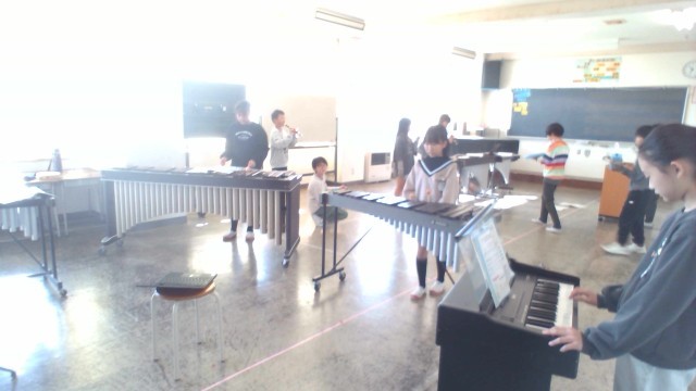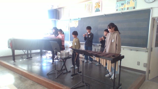 音楽科の学習では、様々な楽器の音色を重ねた演奏をしています。今日は、子供たちがグループで考えた演奏を発表しました。それぞれの音の重なりを意識しながら、演奏できました。
