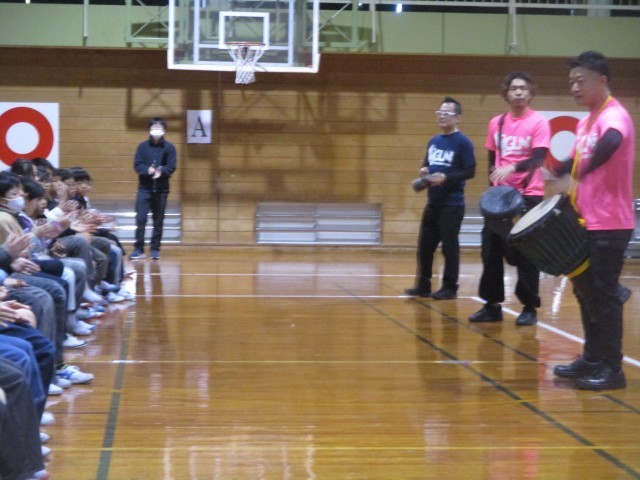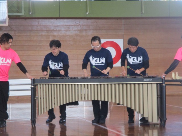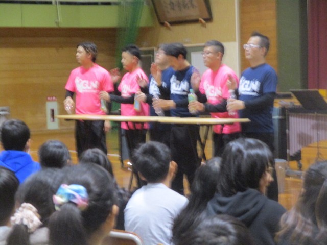 打楽器集団「男群」の皆さんによる、打楽器アンサンブルの学校コンサートがありました。