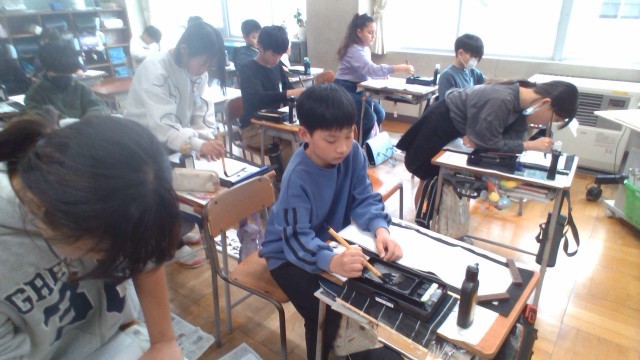 5年生 書写「平和な海」 公開日 2025/11/25 更新日 2025/11/25 5年生の活動 書写の時間には、今年の書初大会の課題である「平和な海」を書きました。今日は初めて書いたので、字の大きさ(ひらがなと漢字の違い)を意識して書きました。練習を積み重ねて、がんばっていきましょう!