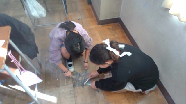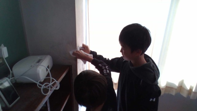 家庭科の時間には、教室や廊下、洗面所の汚れに合う掃除のしかたを調べ、実践しました。調べた方法が実際に通用するのか、試行錯誤しながらそうじに取り組みました。