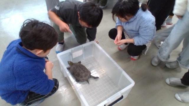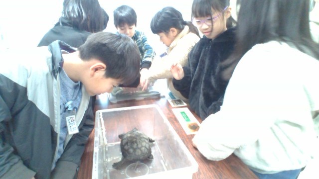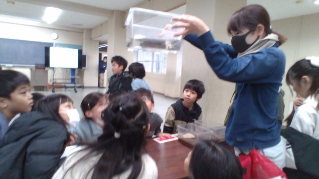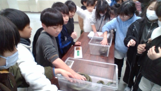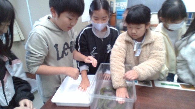 呉羽丘陵には、3年生みんなで成長を見守ったホクリクサンショウウオをはじめ、さまざまな生き物が住んでいること、その生き物を守っていくために私たちができることなどをお話していただきました。さらに、クサガメやイモリ、アオダイショウなどと実際にふれあうこともでき、大喜びの3年生でした。