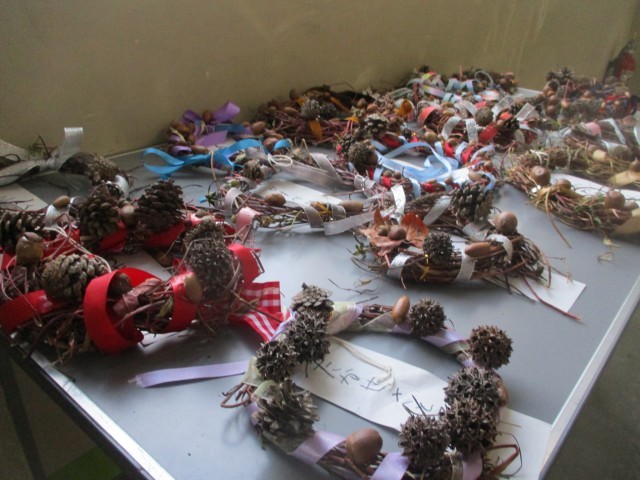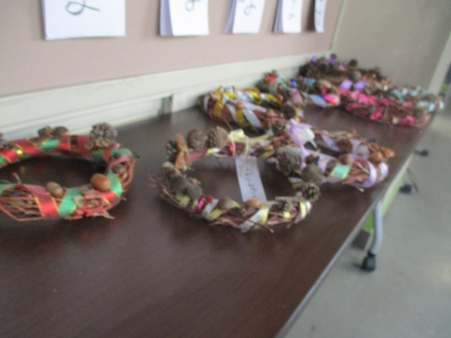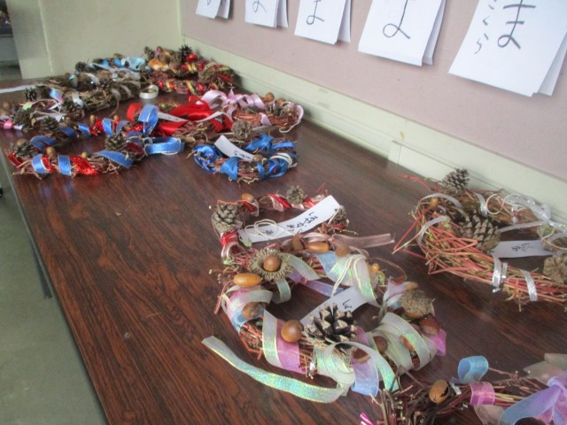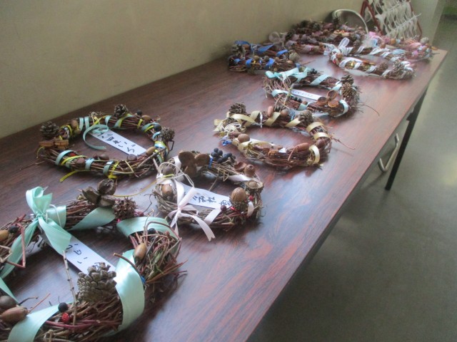 懇談会に来校される保護者の方々に向けて、アサガオの蔓を再利用したリース展示が始まりました。