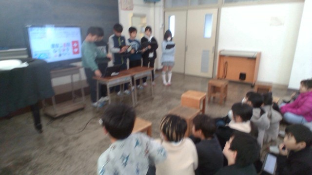 総合的な学習の時間に調べてきたこと、伝えようと考えたことなどをスライドにまとめて、4年生に発表しました。4年生からも、総合的な学習の時間での学びを教えてもらいました。