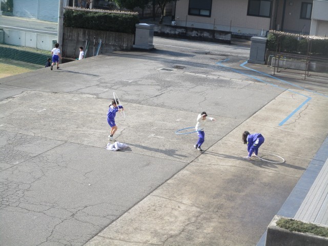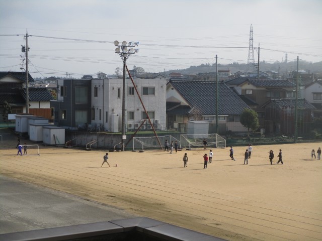 冬の晴れ間に、グラウンドに出て元気に遊ぶ子供たちの様子です。