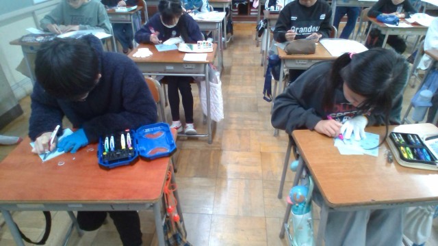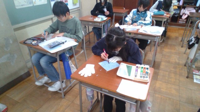 図画工作科の時間には、版画に挑戦しています。彫刻刀を使って、ゆっくりと丁寧に彫っています。彫り具合等に注意しながら制作しています。