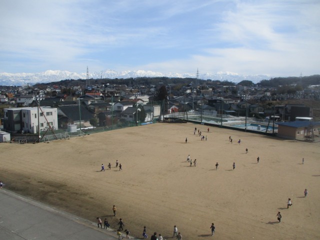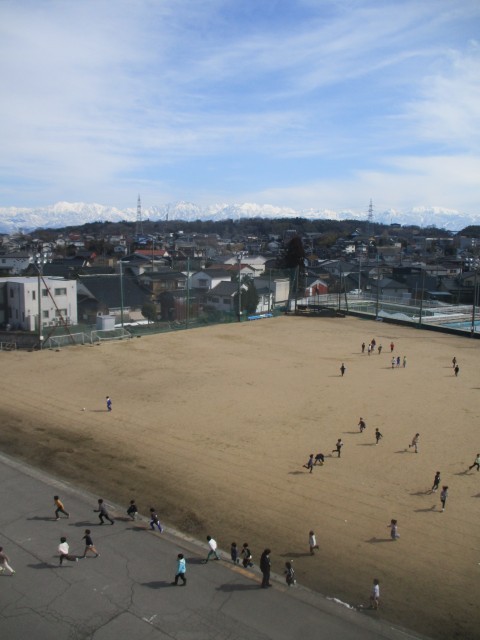 4階ベランダからの今日の、元気に遊ぶ子供たちと呉羽山、そして立山連峰です。