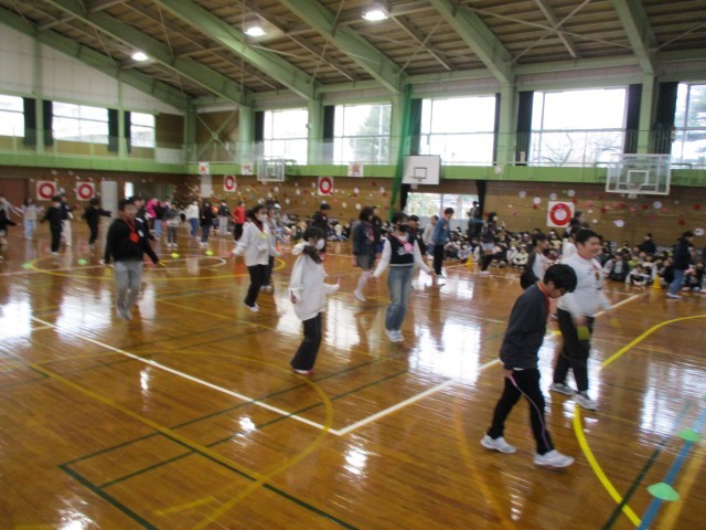 5年生が進行を務め、4年生が縄跳び対決に挑みました。