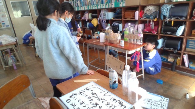理科「ゴムのはたらき」「風のはたらき」「じしゃく」「電気」の学習を生かして、おもちゃをつくりました。今日は完成したおもちゃでみんなで遊びました。楽しんで学習のまとめをすることができました。