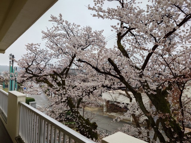 校庭の桜は五分咲き。