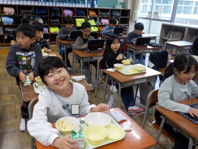 新学期、初めての給食は「チキンカレー」「水菜のサラダ」「フルーツヨーグルト」「牛乳」でした。
