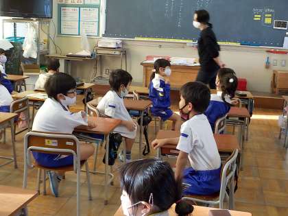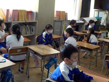 日直のお話を聞いた後、今日のテーマについてペアでお話ししています。