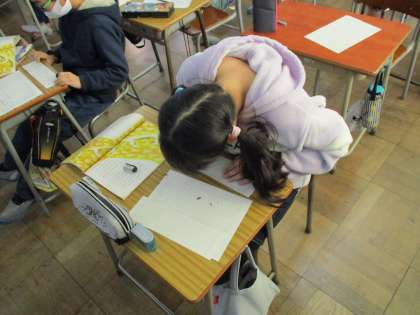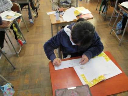 国語科の学習では、昔話や民話の学習をしています。これまで、三年とうげの話の組み立てや話のおもしろい部分を話し合ってきました。学習のまとめとして、話の「しょうかいカード」を作成しています。おもしろい部分の本文を書き抜いたり、条件を付けて理由や感想を書いたりしています。完成が楽しみです。