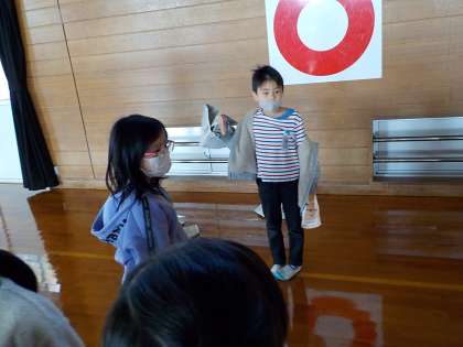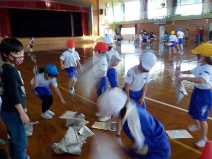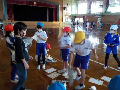 1、2年生が「紙てっぽう鳴らし」に挑戦しました。