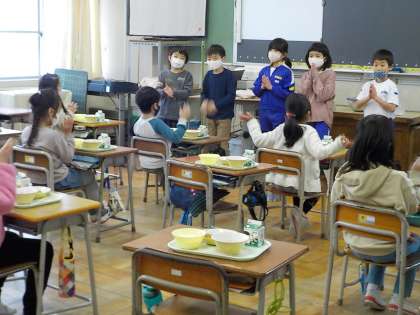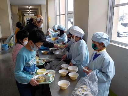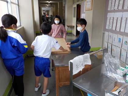 各学級、仲間と協力して給食の準備や後片付けを行っています。