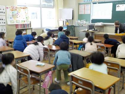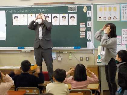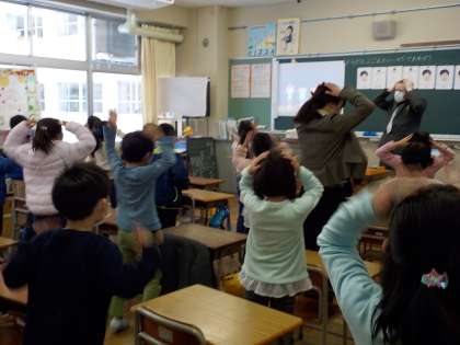 頭、肩、ひざ、つま先等、英語で表現した歌を歌いながら、英語に親しみました。
