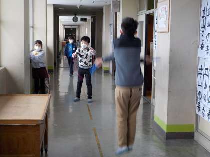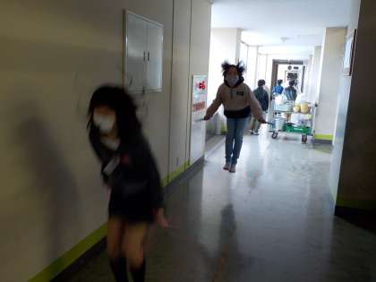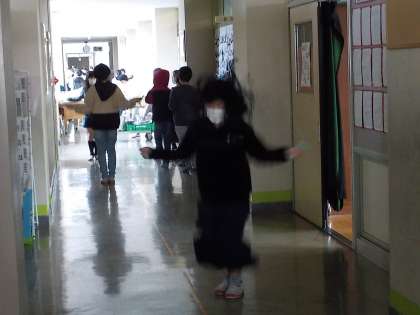 廊下では、自分の目当てに向かって縄跳びの練習をしています。
