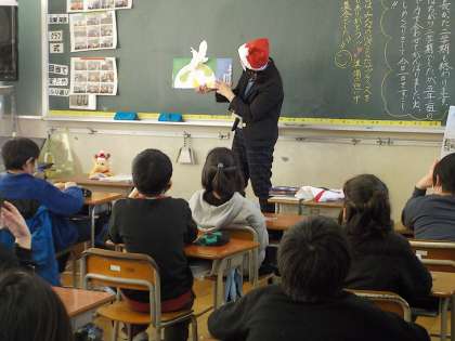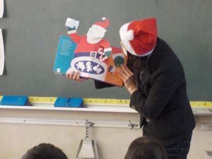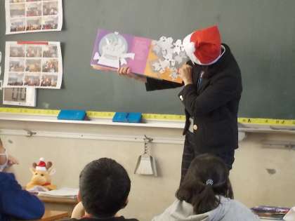 サンタクロースの姿で飛び出す絵本の読み聞かせです。みんな、楽しく聞きいっています。