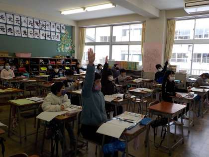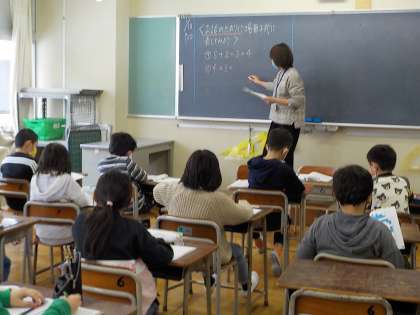 問題の場面を式に表す学習に取り組んでいます。少人数で学習しています。