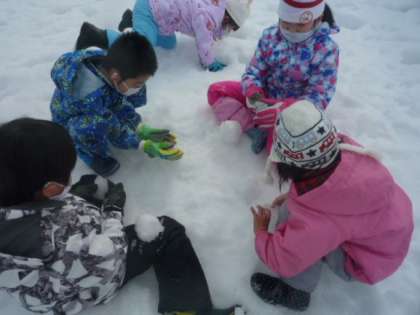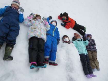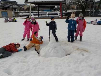 グラウンドで雪遊びをしました。友達と協力して形を作ったり、雪の上に寝転がったりして楽しみました。
