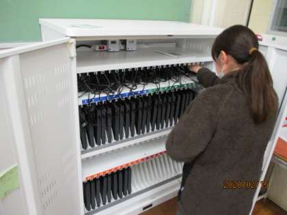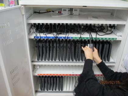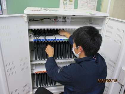 いよいよクロムブックが呉羽小学校に搬入されました。キャビネットに設置し、充電します。
