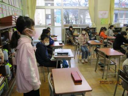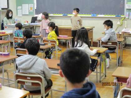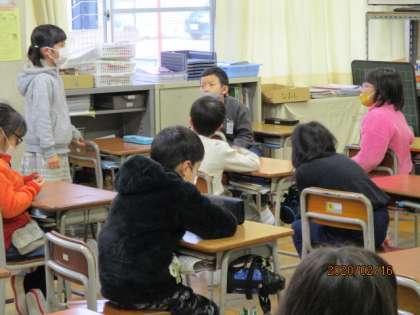 日直のスピーチに対して質問したり、感想を話したりしています。
