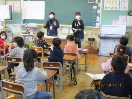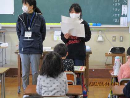 委員会からのお知らせをしっかりと聞いている1年生です。