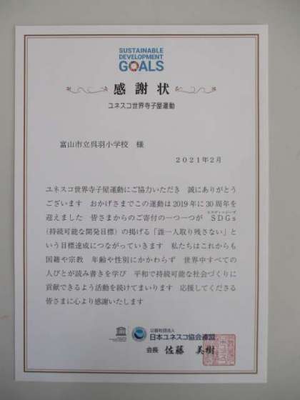 ボランティア委員会では、3学期に書き損じハガキの回収を全校児童にお願いしました。約100枚のハガキが集まったので、ユニセフ協会に贈呈して世界の子供たちのために役立てていただくことにしました。これからも、ボランティアを通して自分たちができる活動を子供たちと続けていきます。ご協力ありがとうございました。