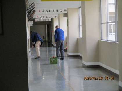 校舎内の階段、廊下、教室等のワックスがけを行っています。