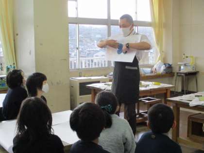 版画「ほって すって」の学習の様子です。まず最初に、外部講師の先生からお話を聞きました。