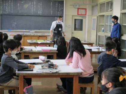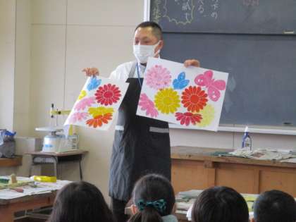 版画「ほって すって」の学習の様子です。まず最初に、外部講師の先生からお話を聞きました。