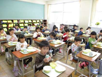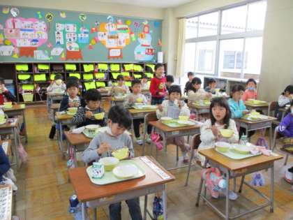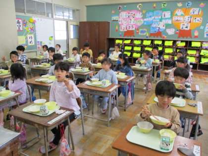 給食の準備にも少し慣れ、しずかに残さず食べています。「ごはんが足りないよ。もっと食べたいな」という元気な声も聞かれました。