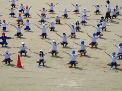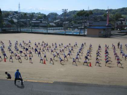 グラウンドでは、3・4年生が運動会で披露する相撲体操の練習をしています。昨日の雨でややぬかるんでいるのですが、気にせず集中して頑張っている姿がとても素敵です。かけ声は例年のような大きな声ではできませんが、揃った動きをぜひご覧ください。