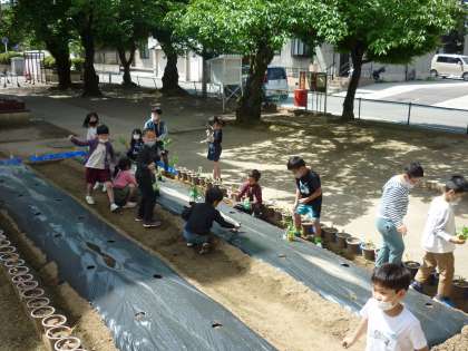 やさいのなえをうえたよ 公開日 2021/05/10 更新日 2021/05/10 2年生の活動 中庭の畑に自分の苗を植えました。 「もっとふかくしたらいいかな」「おいしくそだつといいな」と思い思いに話す子供たちの姿が見られました。どんな風に育っていくか楽しみですね。