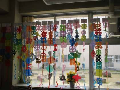 1年生の教室に、きれいな折り紙の飾りが掲示されています。はさみを上手に使って切り抜き、すてきなもようができあがりました。